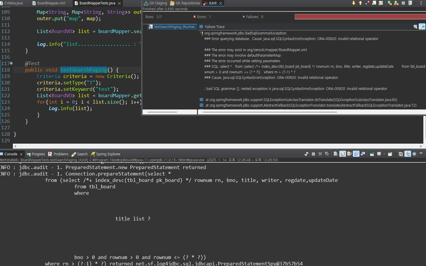 검색조건처리를 위한 Criteria 클래스 변경검색항목(type)과 검색 키워드(keyword) 추가package org.zerock.domain;import lombok.Getter;import lombok.Setter;import lombok.ToString;@Getter@Setter@ToStringpublic class Criteria { private int pageNum; // 페이지 private int amount; // 개수 private String type; // 검색 항복 private String keyword; // 키워드 public Criteria() { this(1,10); // 초기값 } public Criteria(int pageNum, int amount) { su..