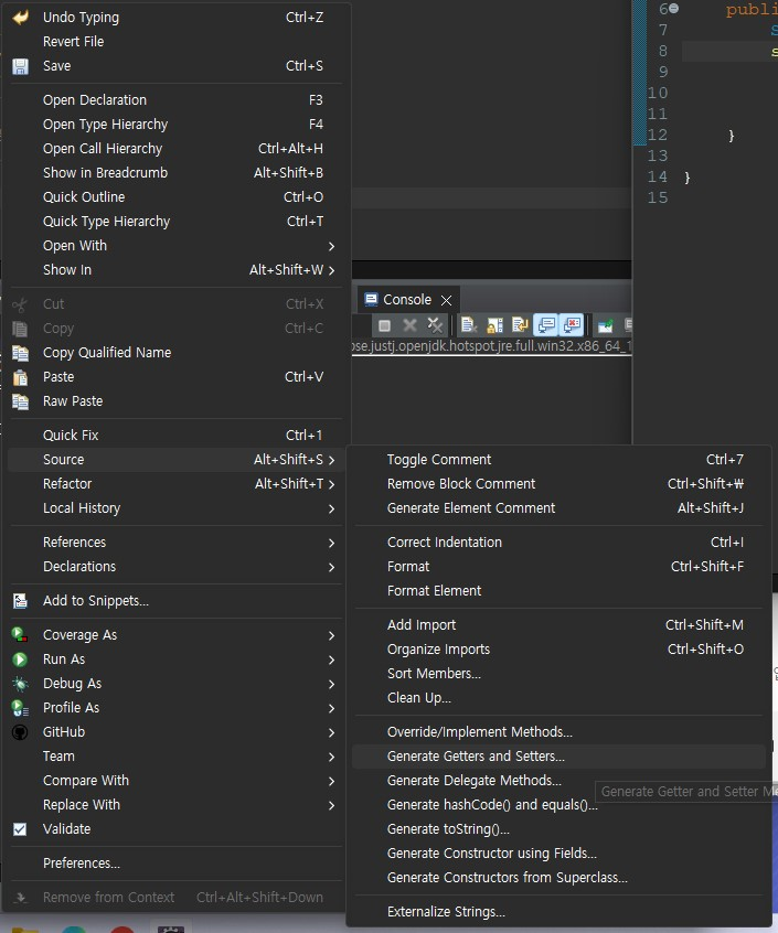 여기서 우클릭 Generate Getters and Setters 클릭하면 그림 5(오른쪽 그림)와 같이 체크한 후 Gnerate 클릭하면 자동으로 생성해준다.