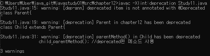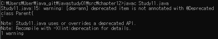 @Deprecated가 붙은 대상이 사용된 코드를 컴파일하면 메시지가 나타남. 에러는 아님